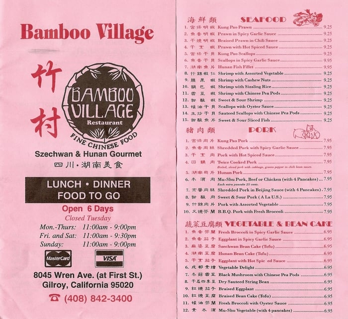 Bamboo Village Restaurant in Gilroy, CA offers a wide range of Chinese cuisine with options for takeout, reservations, delivery, and catering. The menu includes many vegetarian choices, perfect for groups and families. Customers rave about the delicious sizzling rice soup and authentic flavors. The staff is friendly and attentive, creating a welcoming atmosphere for diners. Portion sizes are generous, making it a great value for the price. While some dishes may need a touch of seasoning, overall, the food is flavorful and satisfying. The restaurant only offers takeout currently, but with such positive reviews, it's definitely worth a visit. Don't miss out on trying the won ton soup or the orange chicken!